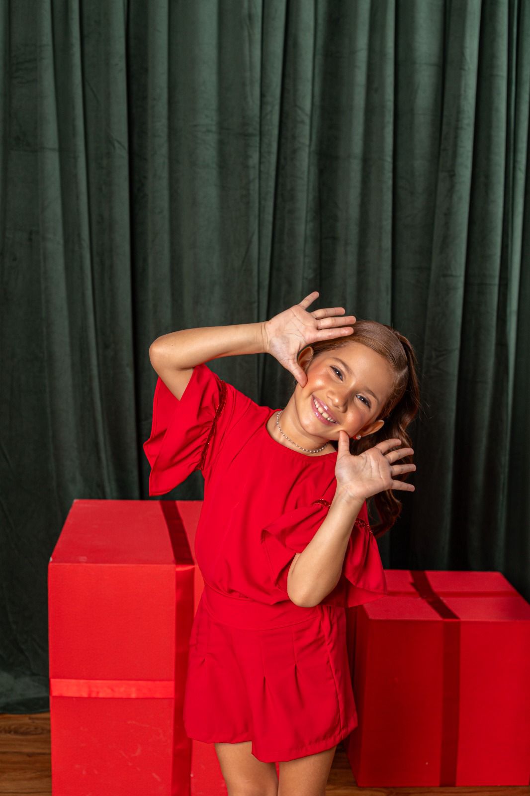 O Conjunto Gabriela Vermelho é pura sofisticação para a sua princesa! A blusinha conta com mangas em babado sino, trazendo movimento e delicadeza, além de uma fita com brilho vermelho que adiciona um toque glamouroso e especial ao look. O botão nas costas garante praticidade e um caimento perfeito.