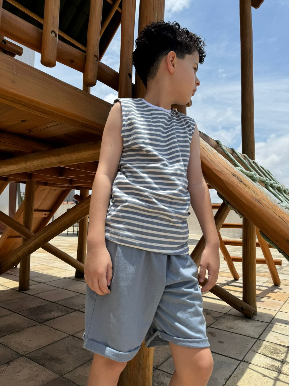Este conjunto é composto por uma regata sem mangas com listras horizontais em cinza grafite e branco, e um shorts liso na cor cinza grafite. A regata apresenta um acabamento em ribana branca na gola, adicionando um toque de charme. Uma etiqueta em couro, delicadamente aplicada, carrega a inspiradora frase: “Vestindo a infância com amor, cor e conforto!” – um reflexo da nossa dedicação em cada peça.