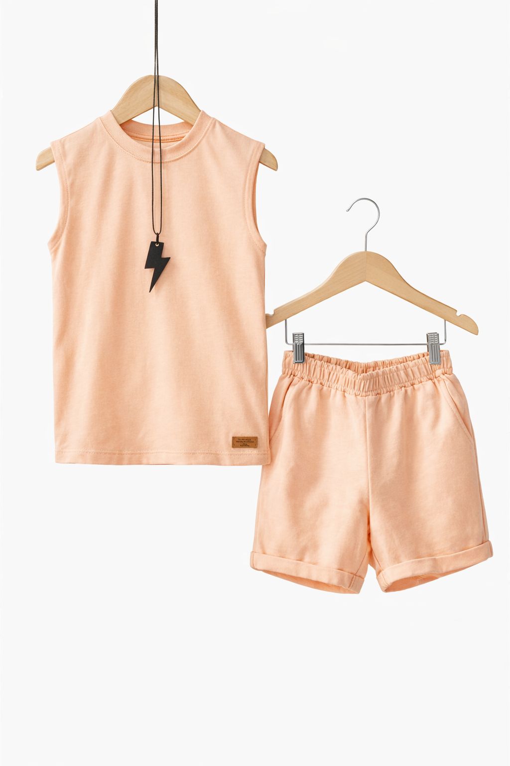 Este conjunto é composto por uma regata sem mangas e um shorts coordenado, ambos na delicada tonalidade salmão. A regata apresenta um design clássico e versátil, ideal para os dias mais quentes. Um detalhe especial é a etiqueta em couro, cuidadosamente aplicada, que carrega a inspiradora frase: “Vestindo a infância com amor, cor e conforto!” – um lembrete do carinho e dedicação que colocamos em cada peça.
