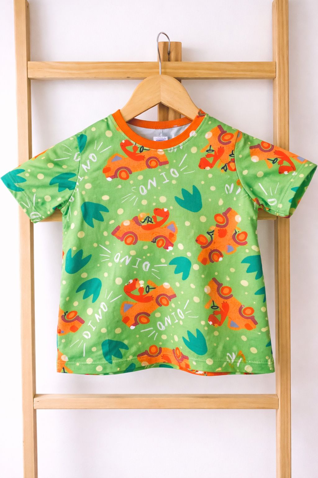 Com fundo verde vibrante e estampa lúdica de dinossauros em carrinhos, essa T-shirt é perfeita para os pequenos que amam aventura e imaginação.