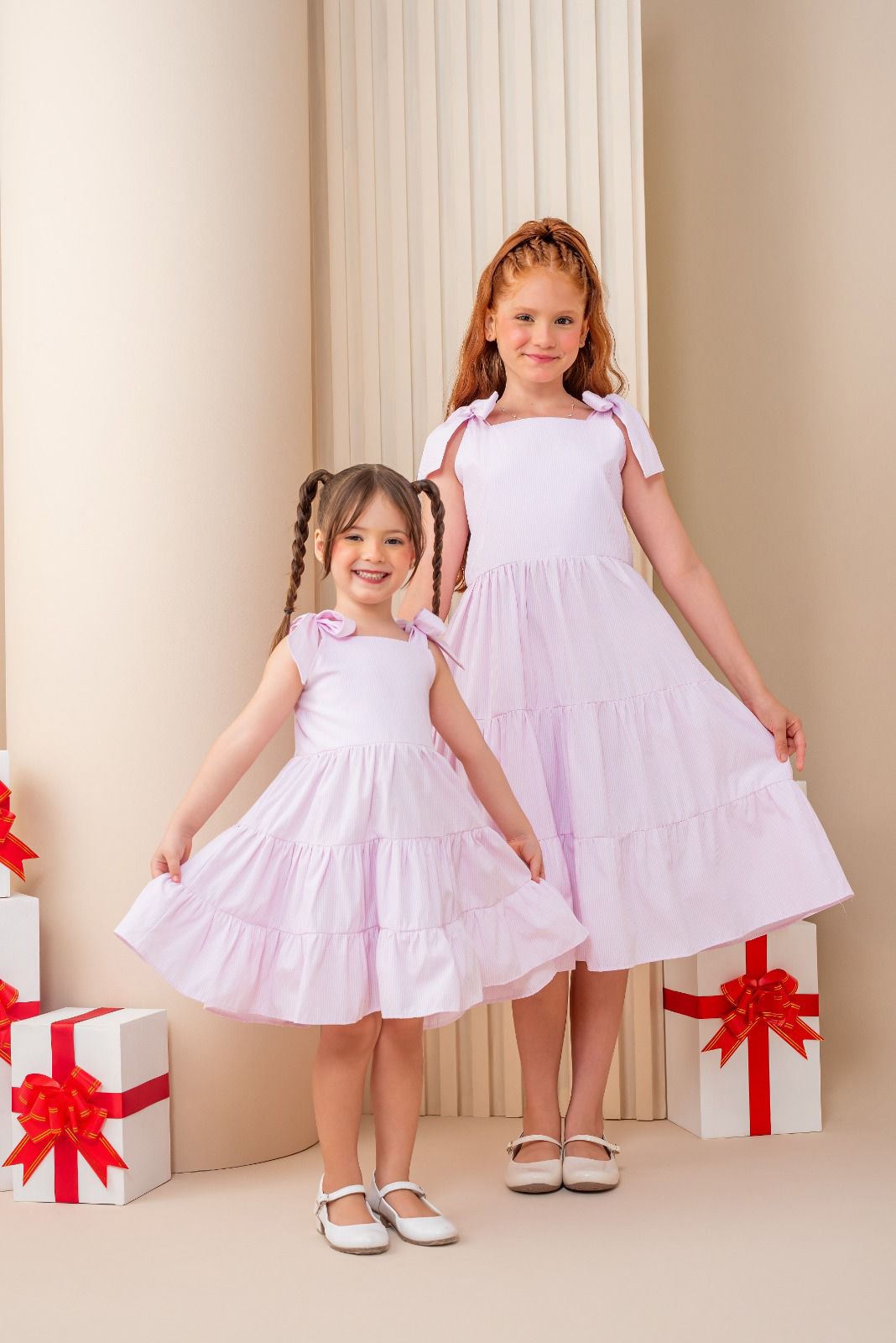 O Vestido Olivia é a escolha perfeita para quem ama suavidade e encanto! Em fundo branco com listras rosa bebê, ele traz um visual leve, doce e super elegante para a sua princesa.